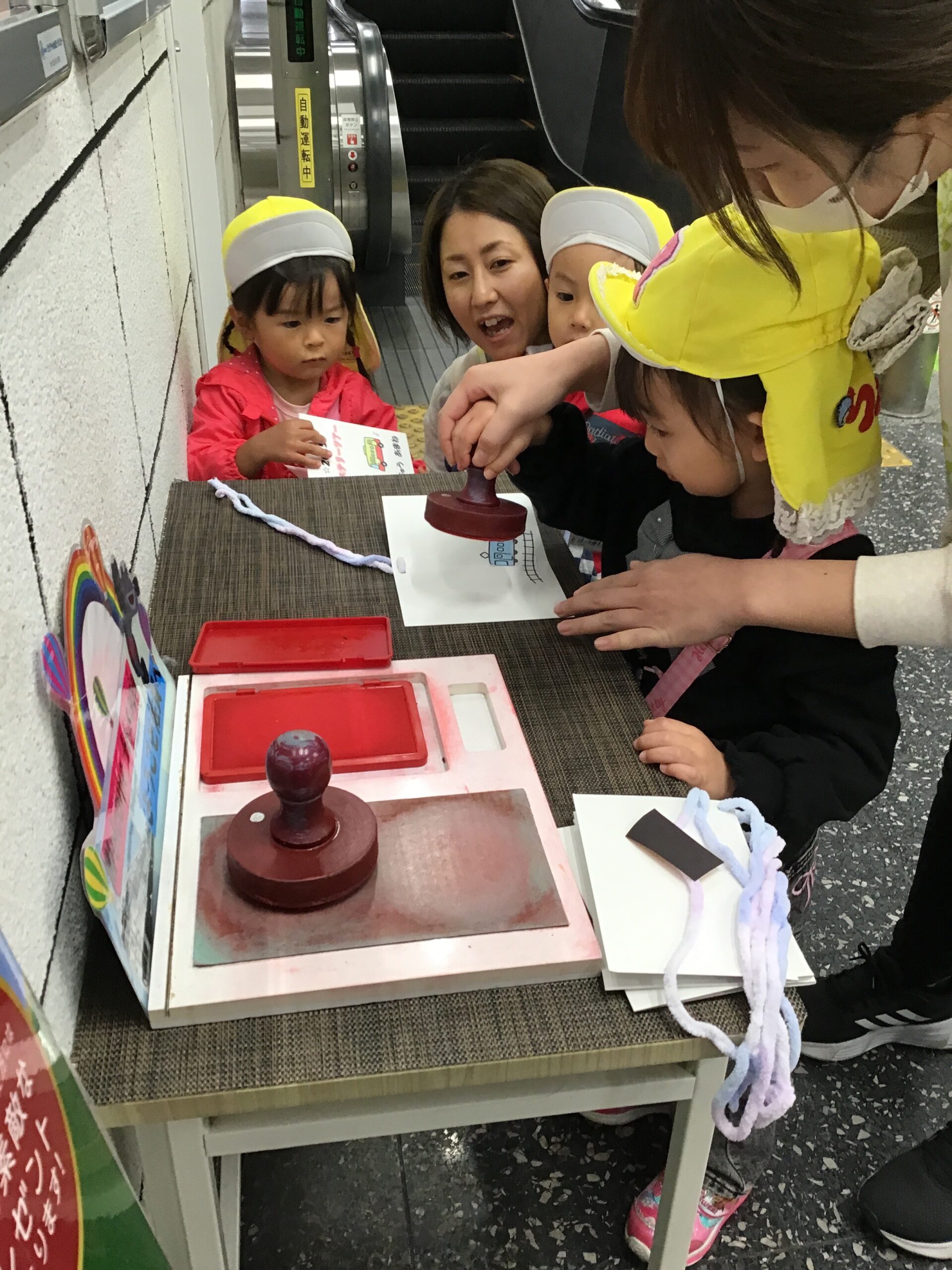 手作りのスタンプカードに記念スタンプを押して、駅の中を散策。お留守番中の0,1歳児さんにお土産も買いました。