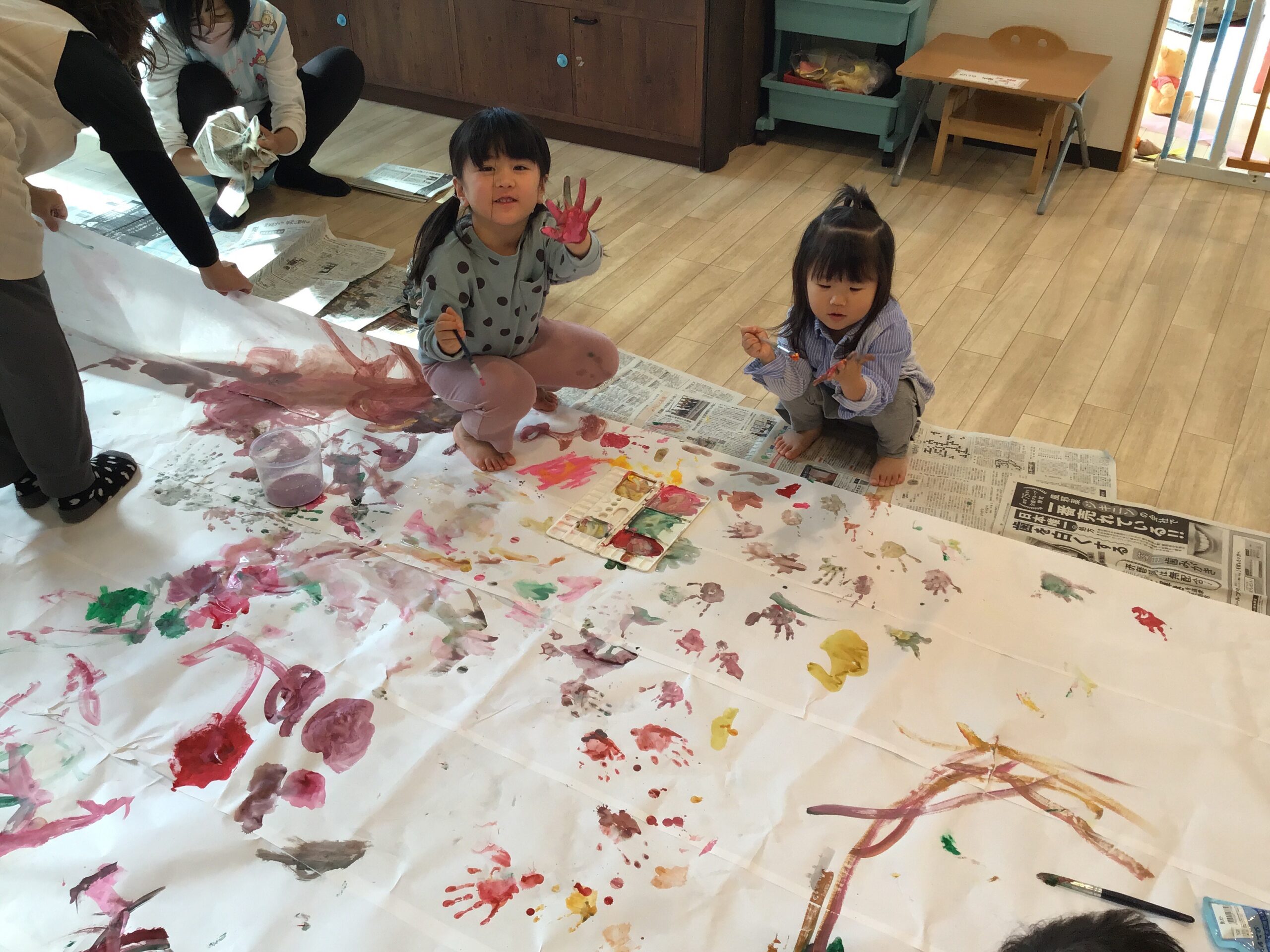 えのぐ遊びをしました♪ 紙を広げて好きなようにぬりぬり☆ 自分の手にぬりぬりしてペッタンペッタン!!かわいい小さな手のスタンプがたくさんできました。 好きな色を混ぜて色の変化も楽しんで、えのぐの感触も楽しんで大満足の子ども達☆