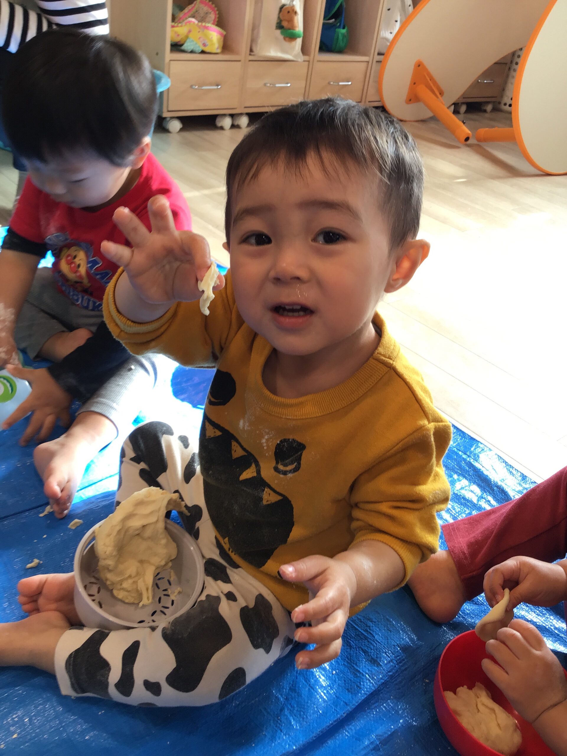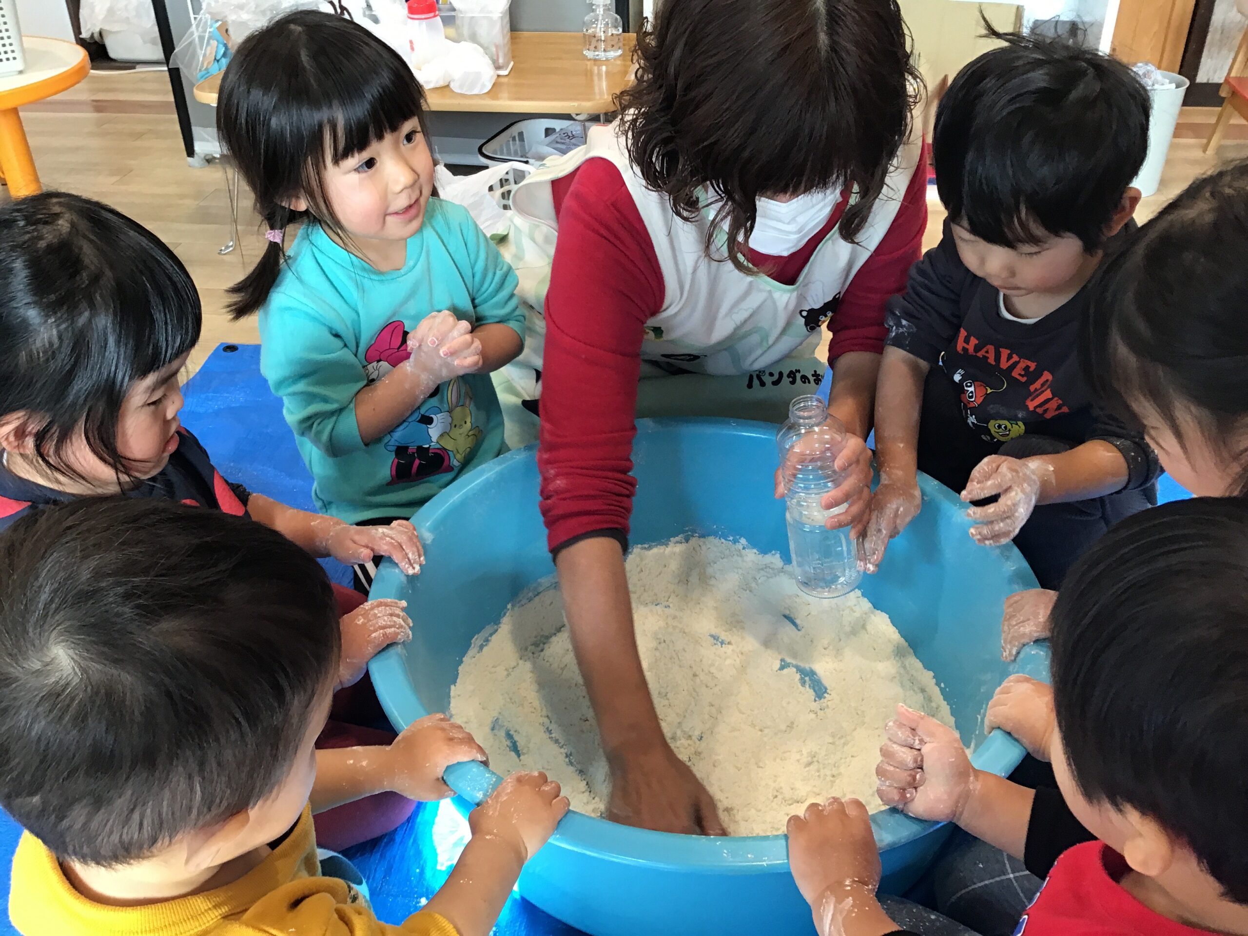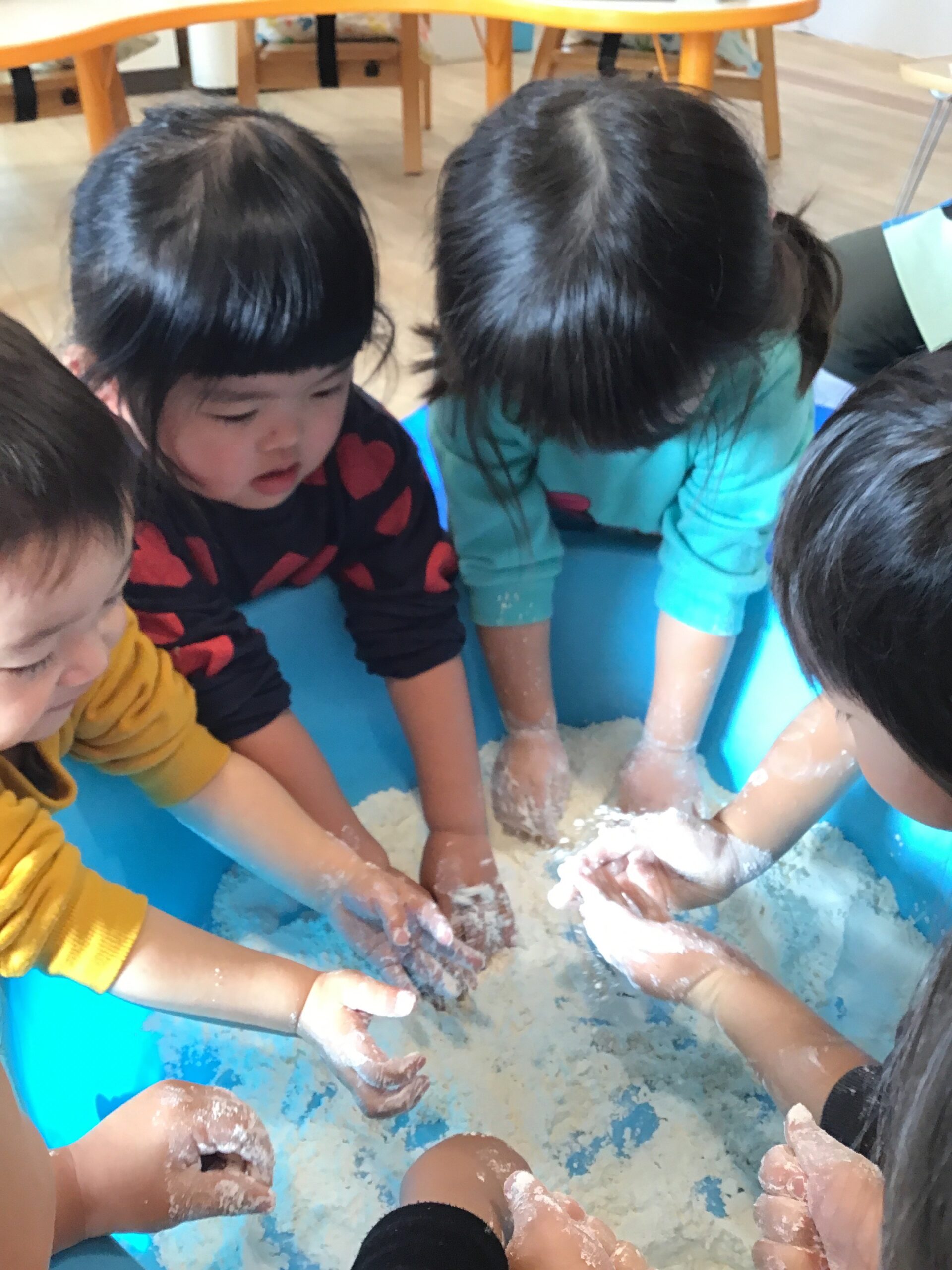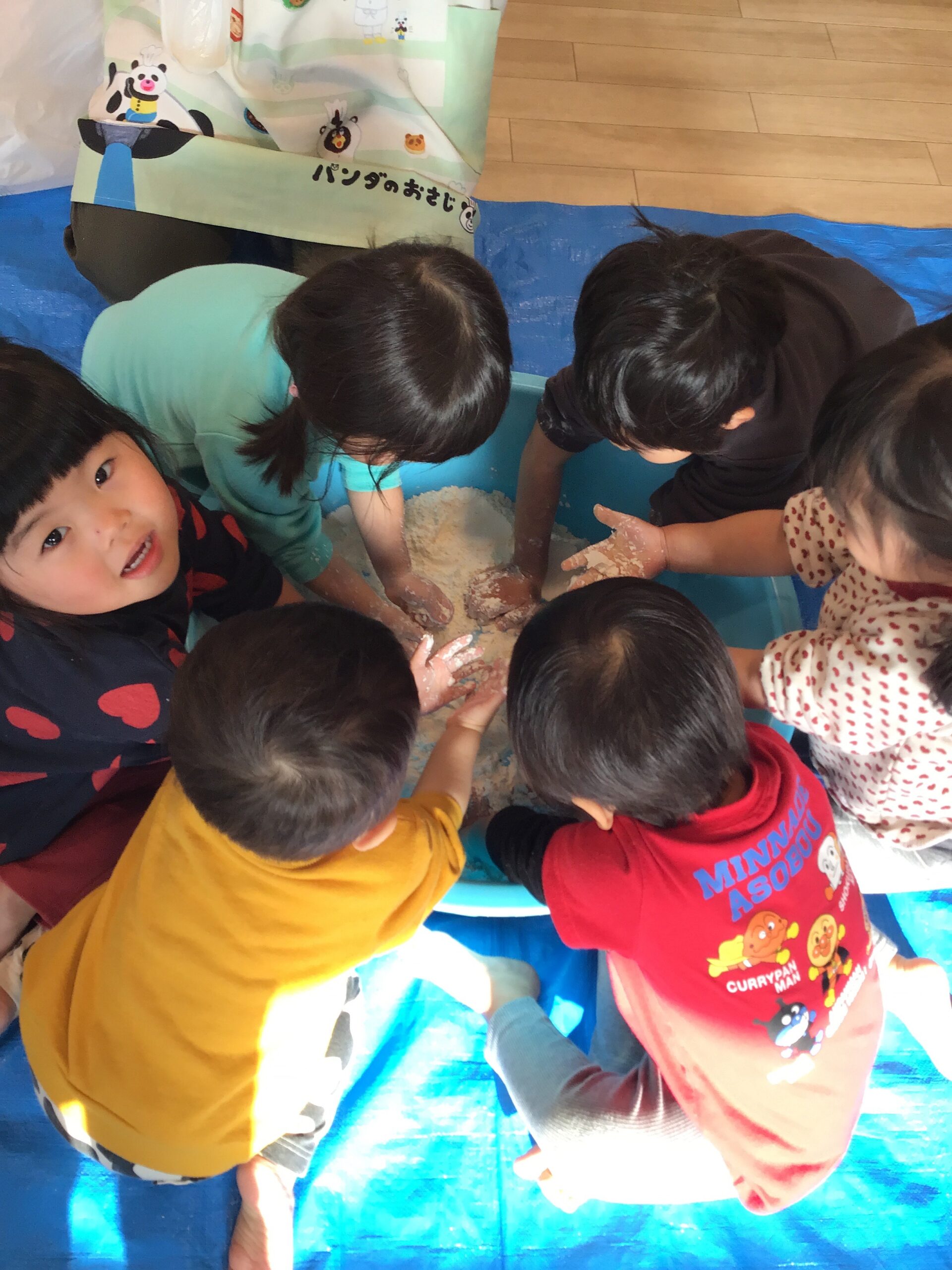 さらさら小麦粉から水をいれてもちもちの小麦粉への感触の違いも楽しめた時間になりました♪