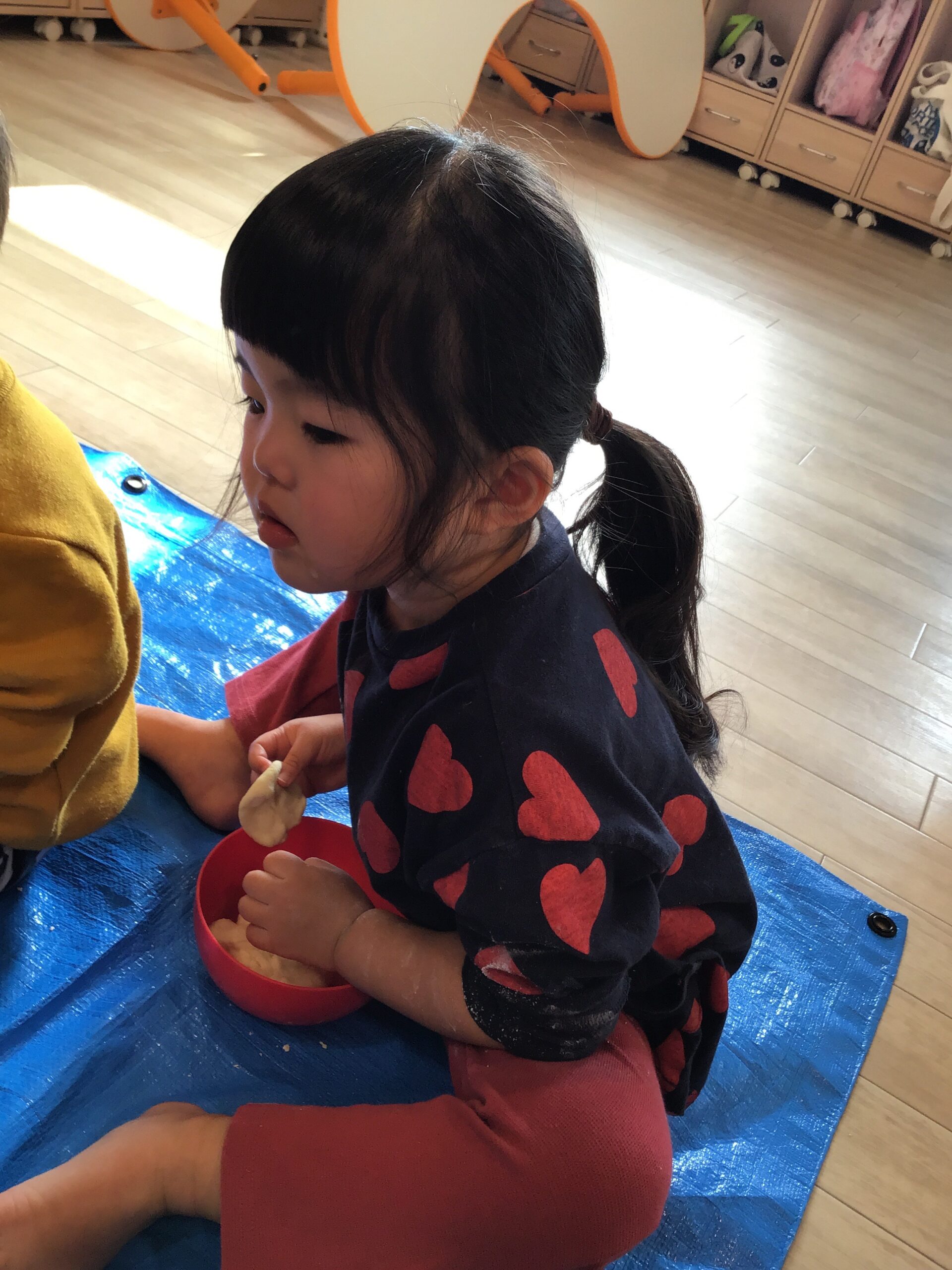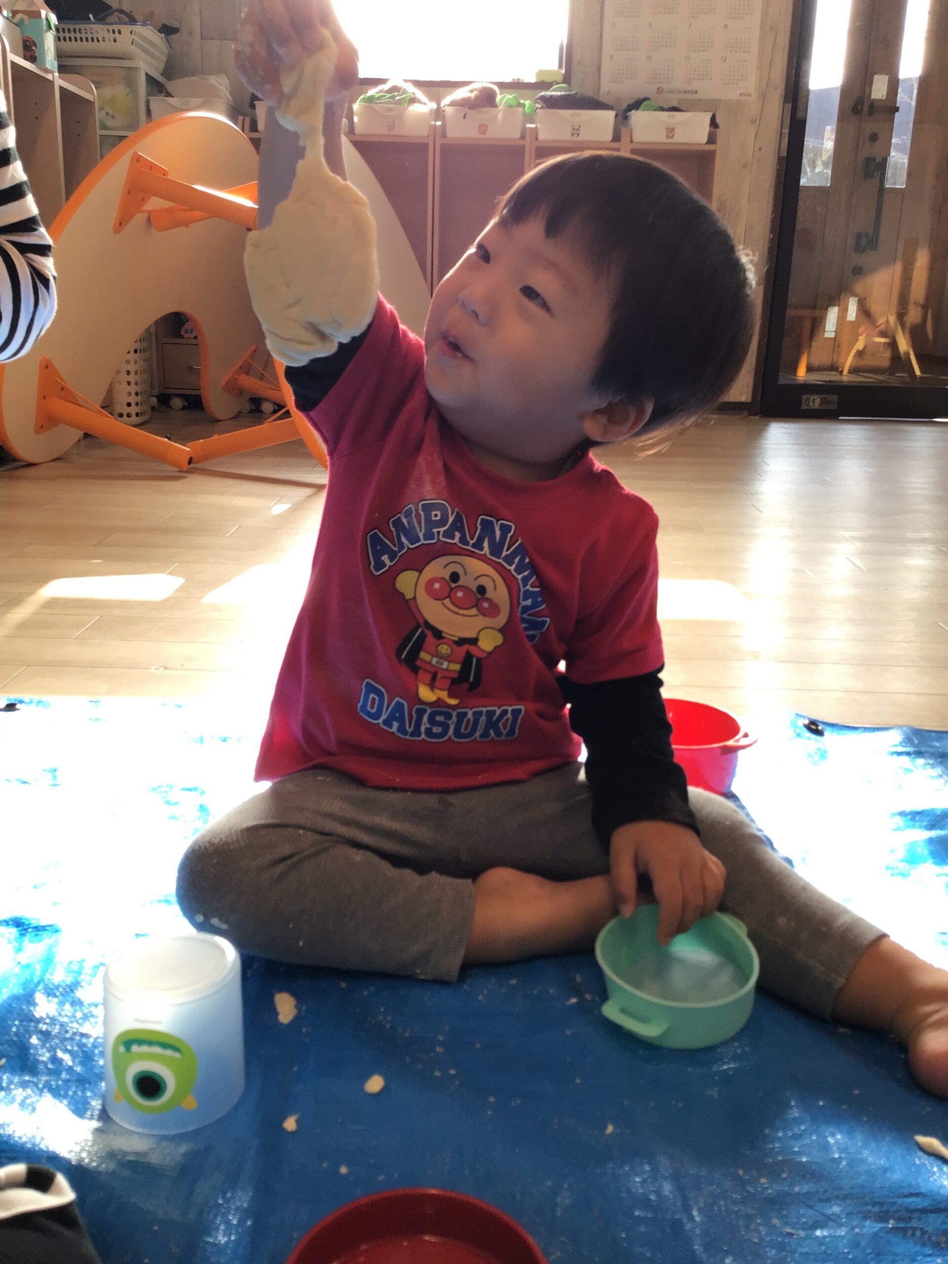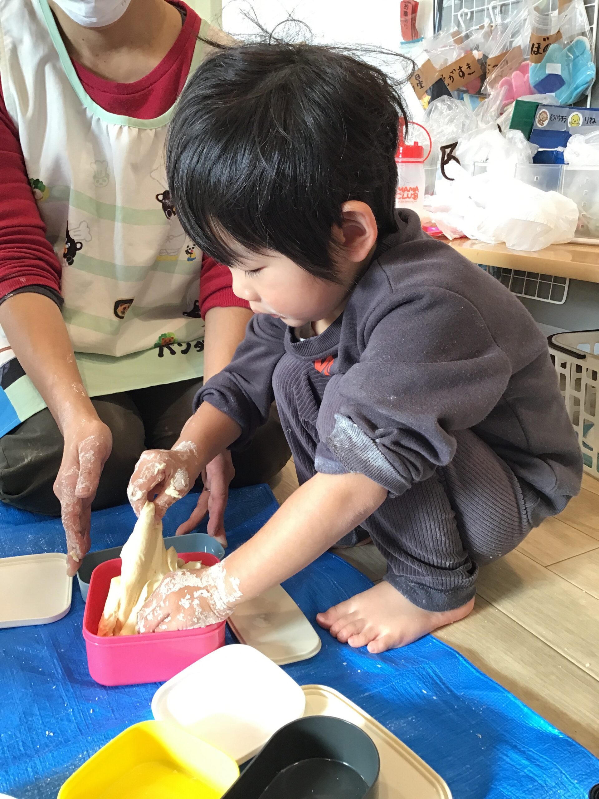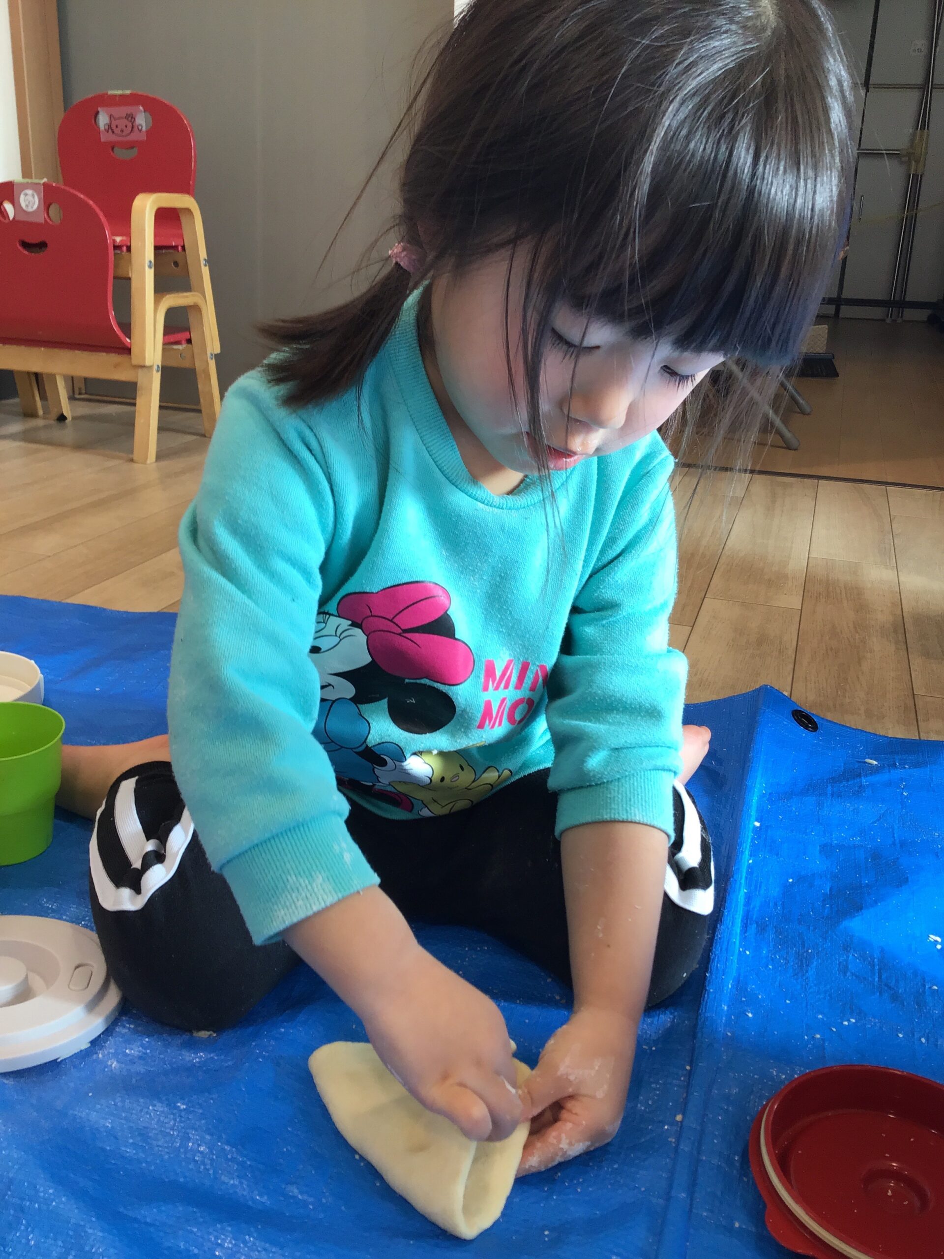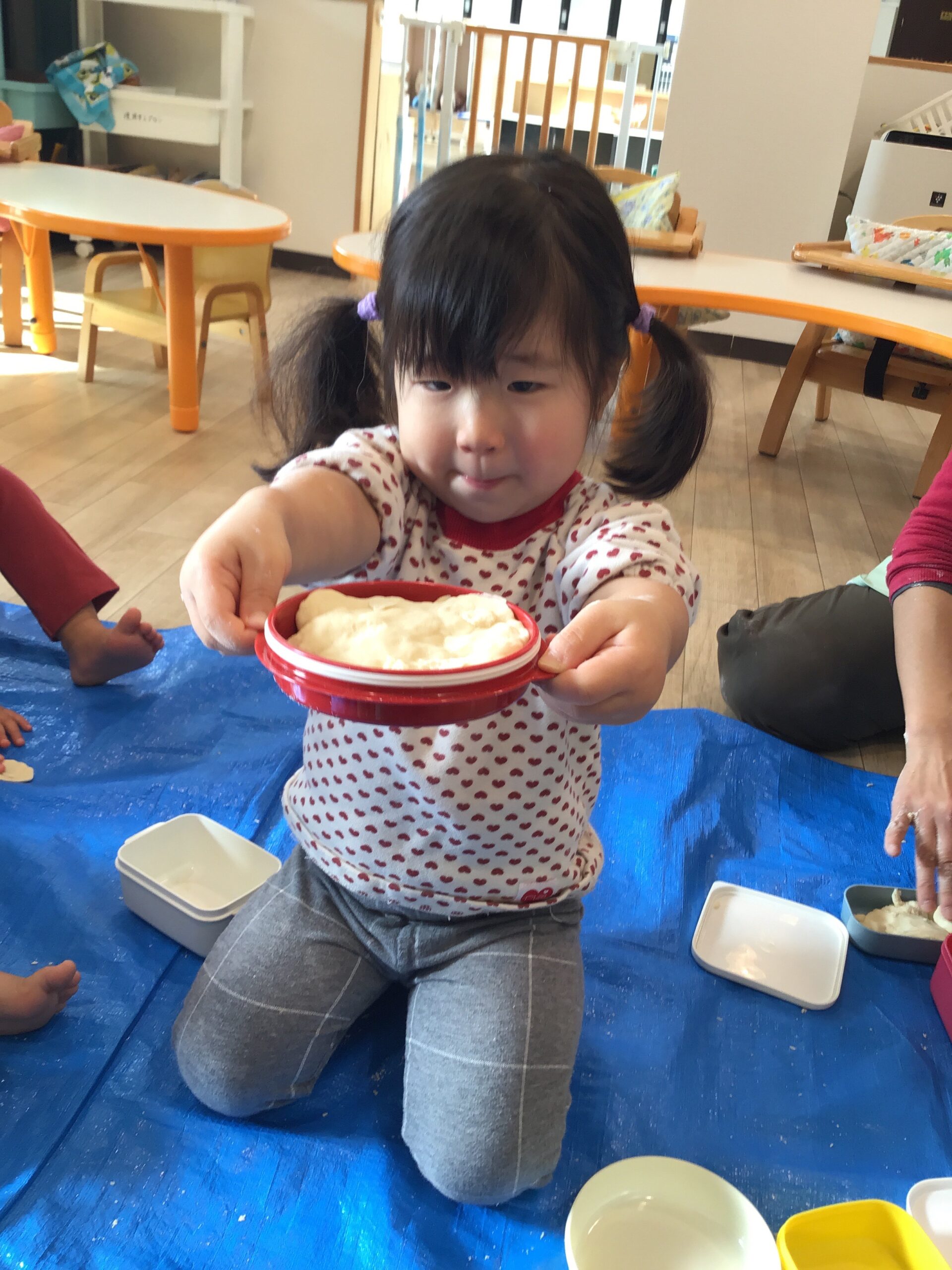 もちもちの小麦粉ができたので、ピザのように丸くしたり、お弁当箱に詰めたりとそれぞれが夢中になって遊んでいました(*^^)v