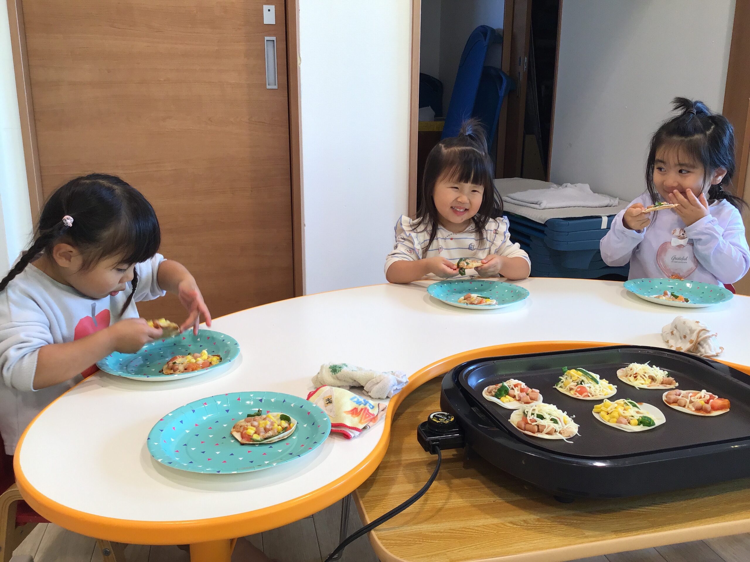 ホットプレートで焼きあがるまでわくわくがとまらない2歳児さん。
